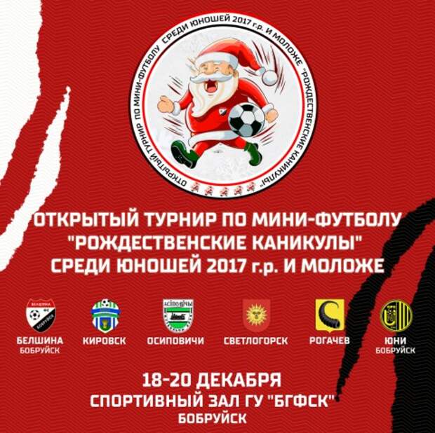 С 18 по 20 декабря в спортивном зале ГУ ´БГФСК´ (ул. Урицкого, 76А) состоится Открытый турнир по мини-футболу ´Рождественские каникулы´ среди юношей 2017 г.р. и моложе.Участие в турнире примут восемь команд, разбитые на предварительном этапе на две группы:Группа ´А´: ´Белшина´ (тренер-преподаватель Разумович С.