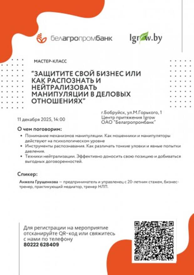 Бесплатный мастер-класс Защитите свой бизнес или как распознать и нейтрализовать манипуляции в деловых отношениях пройдет 11 декабря в Бобруйске11 декабря в 14.00 в центре притяжения Igrow по адресу М.Горького, 1 состоится мастер-класс ´Защитите свой бизнес или как распознать и нейтрализовать манипуляции в деловых отношениях´.